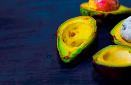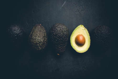 Close up fresh organic avocado halves on old black table background. Healthy food concept