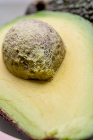 Macro photo, fresh ripe organic hass avocado, cut in half