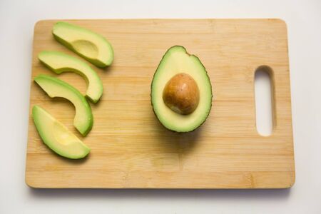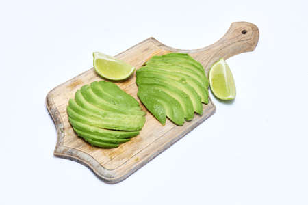 Sliced avocado fruit on wooden chopping board isolated on white background