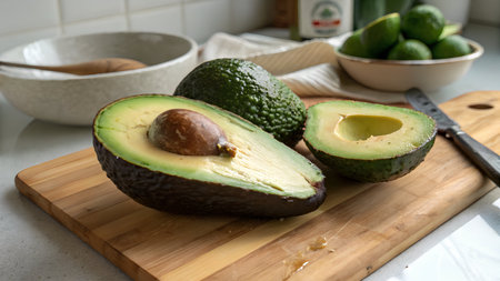 A vibrant avocado is halved, showing its creamy green flesh and seeds, sitting on a wooden cutting board with a softly blurred kitchen backdrop.
