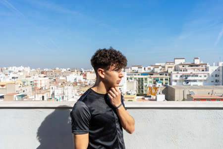 Mixed race male standing on boardwalk smiling enjoying evening walk