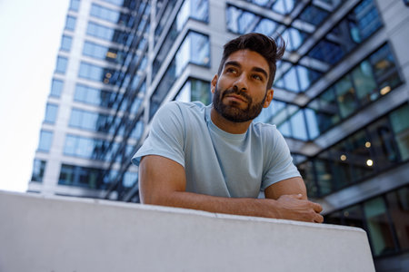Handsome man standing in modern big city on background of glass skyscrapers and looking away