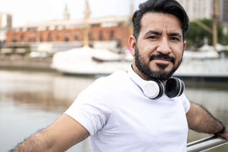 portrait Latin bearded man with headphones smiling at camera and listening to music in park