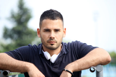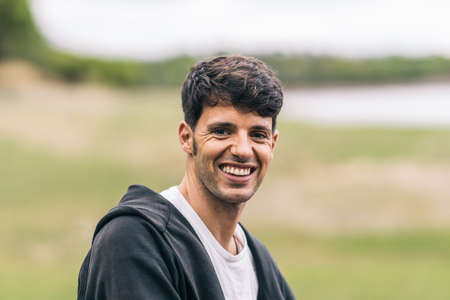 portrait of a Handsome young strong sports man posing outdoors at the nature park location