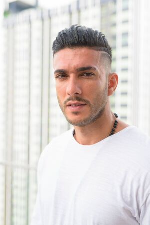 Face of serious bearded caucasian armenian young man looking at camera. Attractive guy stand on street city lifestyle. People. Beauty. Stand outdoors