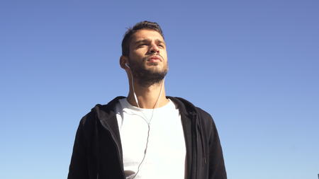 Close-up portrait of caucasian handsome bearded hipster man. Outdoor.