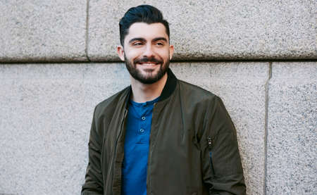Portrait of handsome bearded man in casual clothes smiling and looking at camera
