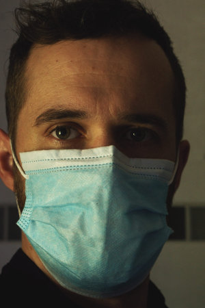 Close up portrait of a white man wearing a face mask and looking worried. Shallow depth of field isolated on black background. High quality photo