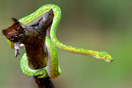 Green pit viper on a tree branch with green background.