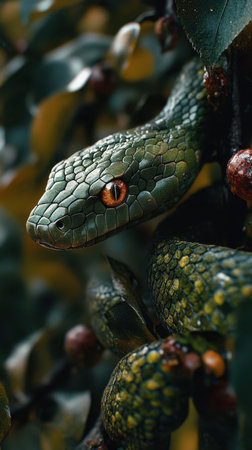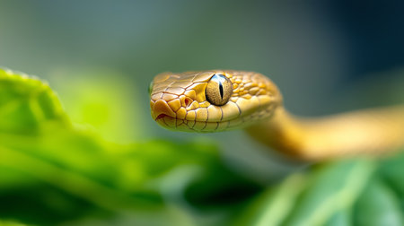 A striking close-up of a snake peeking through lush green foliage in a vibrant jungle. The intricate scales and captivating eyes highlight the beauty of wildlife in its natural habitat.