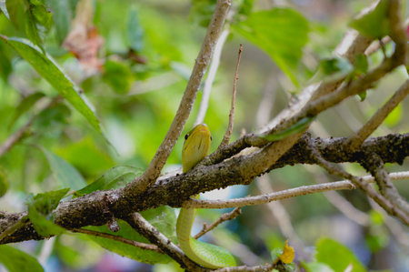 closeup healthy Oriental whip snake or Green viper (Ahaetulla prasina) wiggle or resting on tree