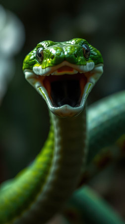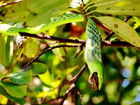 Vibrant green snake displaying its open mouth in a natural habitat during daylight