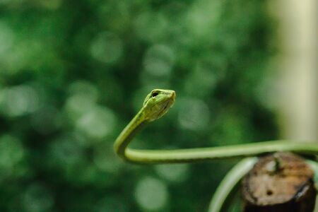Green snake on a branch in the garden, closeup of photo