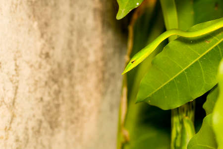closeup healthy Oriental whip snake or Green viper (Ahaetulla prasina) wiggle or resting on tree with copy space