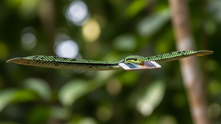 A green snake is flying through the air with a small object in its mouth