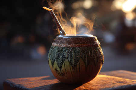 Glass mug of herbal tea with lemon slices on bamboo tray in sunlight. That the image is generated using AI.
