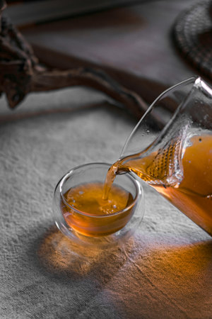 Pouring Herbal Tea into an elegant Glass Cup creates a soothing ambiance for tranquil moments