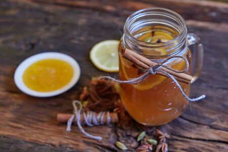 Chrysanthemum tea in cup over the old wooden table background . selective focus