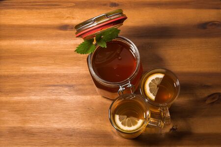 A jar of lemonade sitting on a wooden table. Generative AI image.