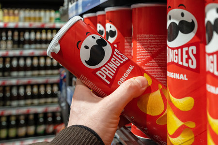 Tyumen, Russia-December 08, 2021: Pringles chips paprika. Owned by the Kellogg Company.