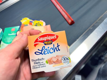 Fish preserves in hand at counter - Shopping at rewe