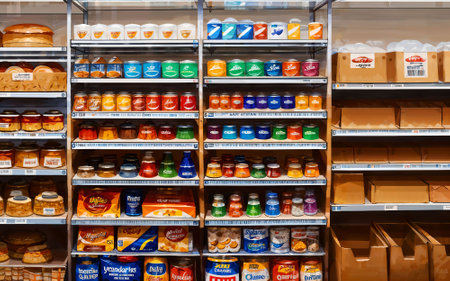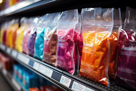 Rack with colorful product packages in the supermarket, vibrant colors and light reflections, Generative AI