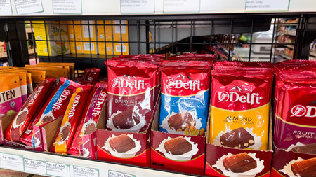 Variety of chocolate boxes arranged on grocery store shelf. concept of sweet indulgence, gift selection, chocolate lovers. Bekasi, Indonesia, December, 22, 2025