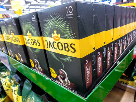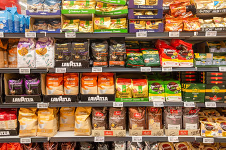 Frankfurt, Germany - 02/23/2021 Shelf in the grocery store with various coffee varieties from various suppliers. Horizontal