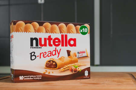 Carrara, Italy - April 19, 2020 - Pack of Nutella B-Ready snack bars on a wooden cutting board. Nutella is a world famous hazelnut cream.