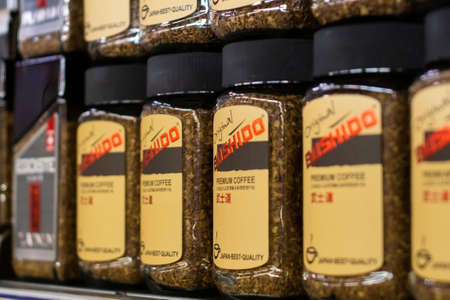 Volzhsky, Russia-may 10, 2019: Bushido coffee instant coffee sales on hypermarket shelves selective focus