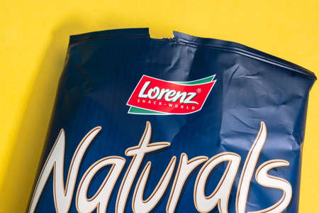 Tyumen, Russia-June 21, 2021: Lorenz Naturals parmesan cheese potato chips bag close up.