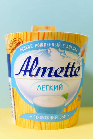 Tyumen, Russia-October 15, 2021: Almette cream cheese. Light cheese. Copy Space