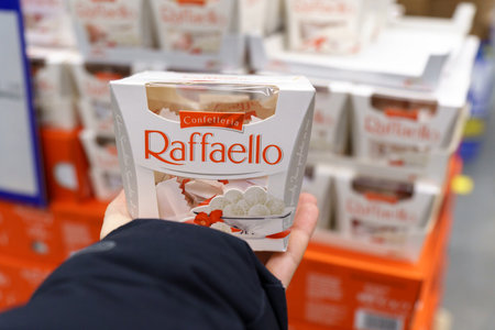 POZNAN, POL - APR 13, 2021: Boxes of Raffaello, a brand of coconut-almond praline manufactured by Ferrero SpA, chocolate producer and confectionery company headquartered in Alba, Piedmont, Italy