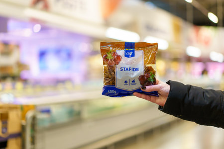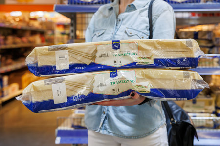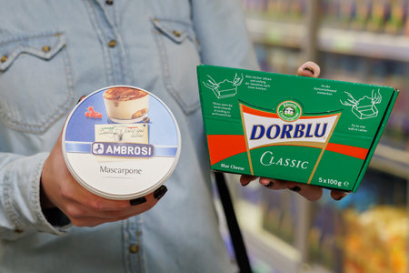 October 11, 2023 Beltsy, Moldova. For illustrative editorial use. Mascarpone in the hands of the buyer