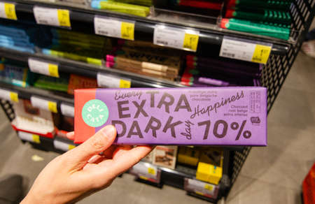 Antwerp, Flanders, Belgium. August 2019. Belgian chocolate is a specialty appreciated in the world: at the supermarket a vast display of wrapping tablets with bright colors. The hand chose extra dark.