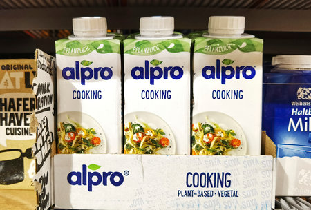 Berlin, Germany - January 25, 2021: View to a shelf with packages of vegan milk beverages in a supermarket.