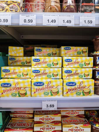 Podgorica, Montenegro - 02 july 2020: Dukats packets of butter on a shelf at the supermarket.