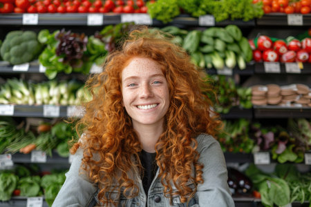 A young woman with red curly hair smiles brightly in front of a produce aisle at a grocery store.
