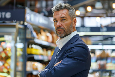 Portrait of mature businessman standing in supermarket, looking at camera.