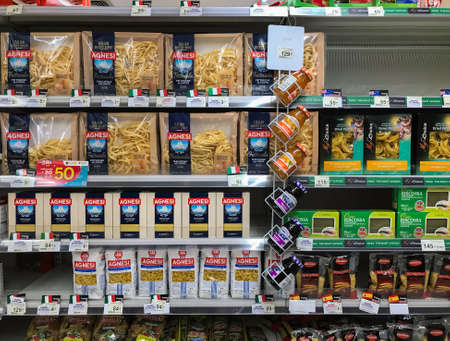 Bangkok Thailand-March 26,2020:Shelves of italian pasta and fruit jam imported products in a supermarket,amid corona virus fears, shoppers panic buying and stockpiling.