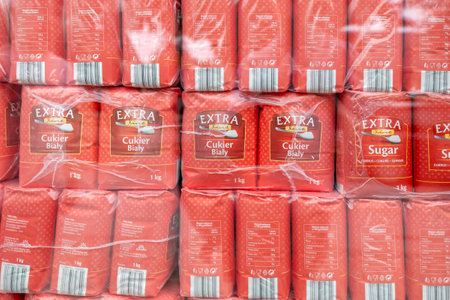Lots of 1kg packs of Polish brand sugar in storage prepared for sale, sugar production, food necessities many packs of sugar in the store concept, nobody, no people