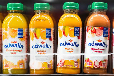 July 10, 2020 Santa Clara / CA / USA - Odwalla juice bottles displayed in a supermarket refrigerator; In July 2020, Coca-Cola announced the discontinuing of its Odwalla operations and brand