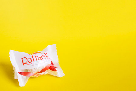 BELARUS, NOVOPOLOTSK - 11 MARCH, 2021: Raffaello candy on yellow background, copy space