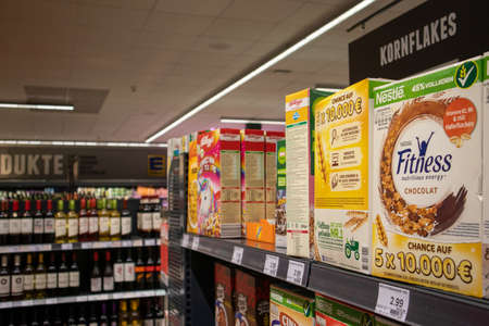 MUNICH, GERMANY - Dec 20, 2019: Cereals and wine bottles on shelves in a german supermarket