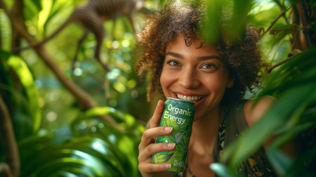 An AI generated illustration of Young woman smiling with an energy drink in hand