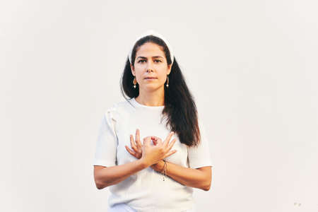 Portrait of woman holding gyan mudra next to heart, hand position from Kundalini yoga meditation Love is Love. This meditation removes any duality between love in your life and love in your soul
