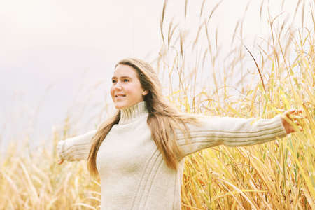 Fall portrait of young pretty girl posing outside with pampas grass, wearing warm beige pullover, windy day