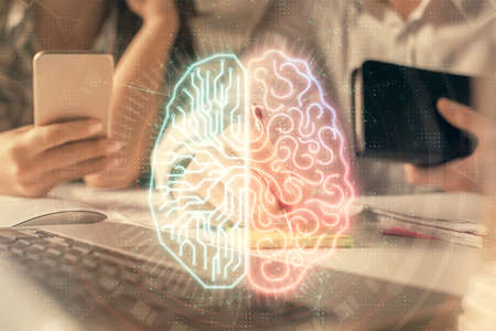 Double exposure of man and woman working together holding and using a mobile device and brain hologram drawing.