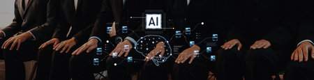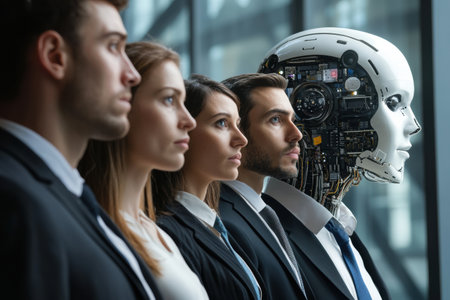 A diverse group of business professionals in suits participates in a discussion, exploring the implications of artificial intelligence on various job sectors and workplace dynamics.