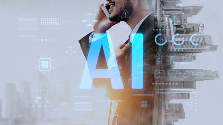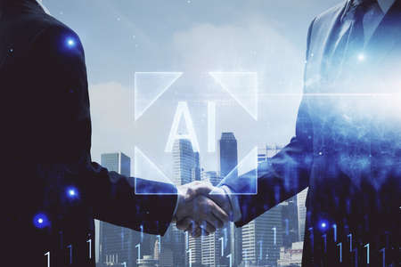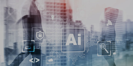 Double exposure of creative artificial Intelligence abbreviation hologram on blurry cityscape background. Future technology and AI concept